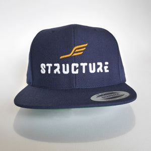 Whether it's a bad hair day or protection from the sun, this cap has got you covered. An authentic snapback cap with an embroidered Structure logo, navy blue with gold wings and white lettering. This is a Limited Edition as the design and/or colors will change when these are gone. Snap back adjustable sizing.