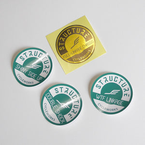 Got a place where you plaster stickers, need stickers to start plastering a spot? Structure Sticker Set One is here to help. These three inch round stickers include: one black and shiny gold 'Full-Linkage Chassis' and three white and green ones: 'WTF Linkage', 'Shiny Side Up' and 'Double Shock'.