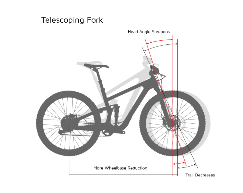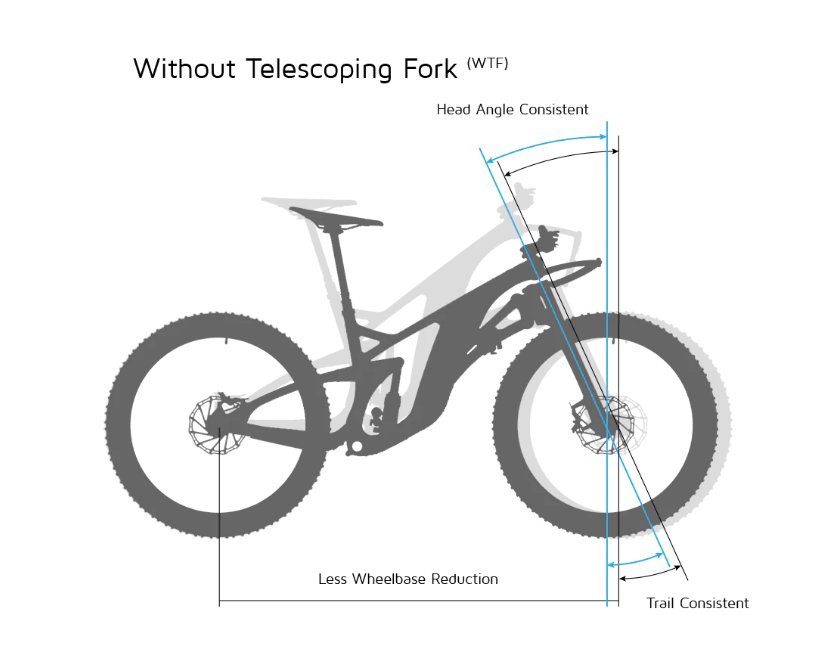 Trail, the measurement of front wheel steering stability, starts short and nimble at sag and grows under compression to as much as double that of a telescoping fork